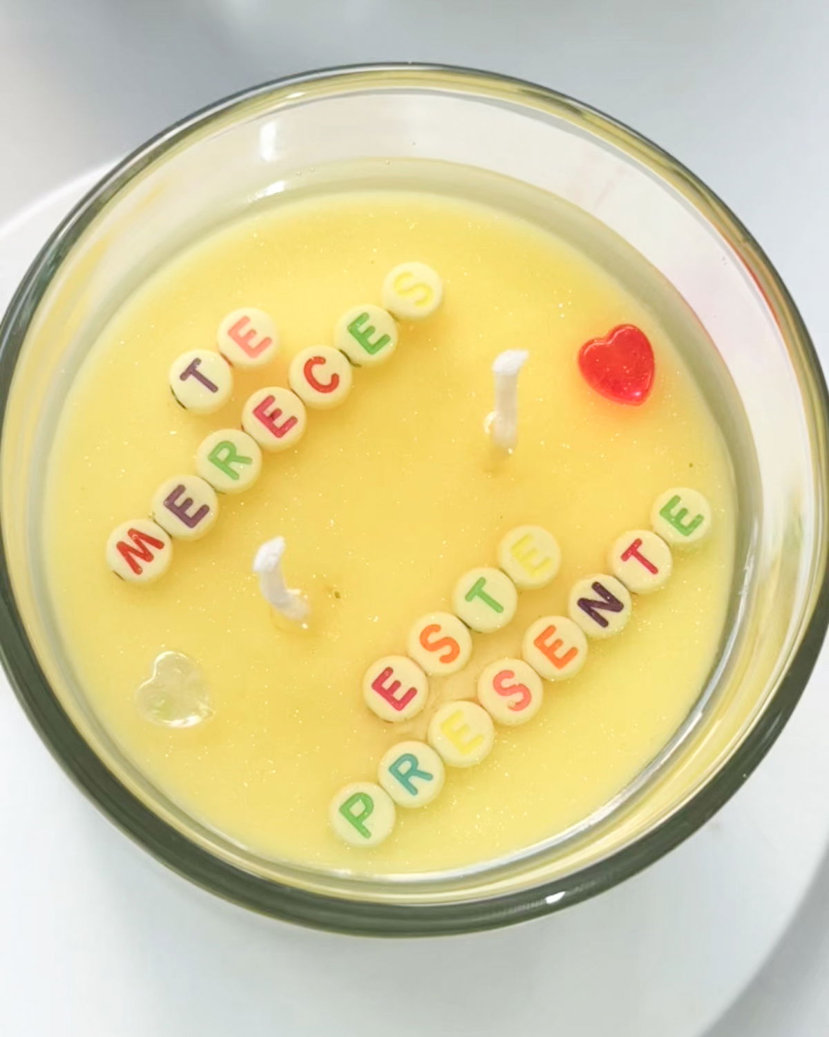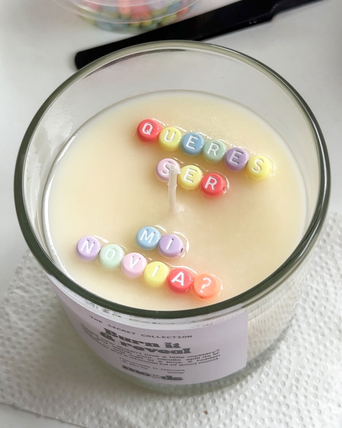 Una vez revelado el mensaje, podés rescatar las letras, limpiarlas y transformarlas en un llavero usando los elementos extras que vienen con la vela — un recuerdo que te queda para siempre.